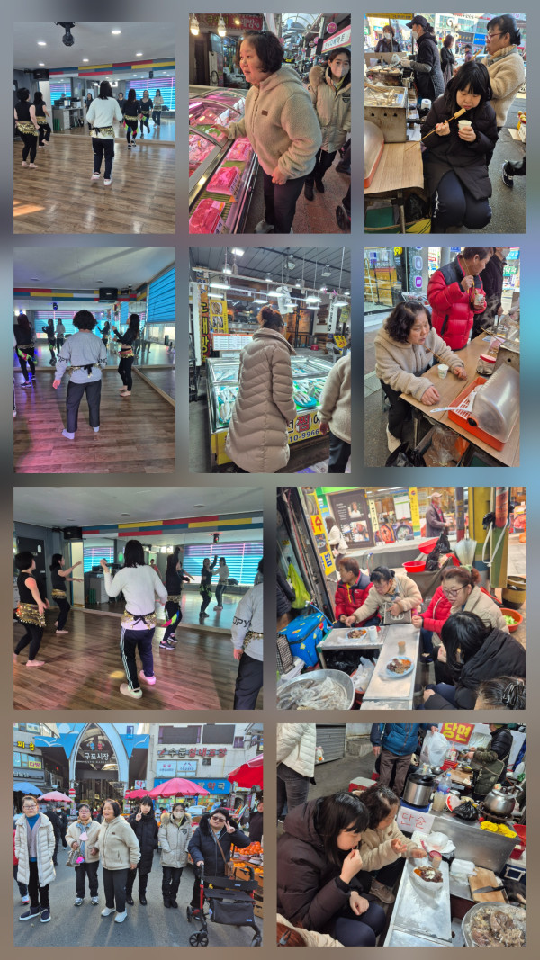 2025.12.30(화)주간활동서비스 1그룹 활동진행 페이지 정보 조회 : 174회 작성일 25-12-30 17:39 SNS 공유 : 본문 벨리댄스 수업 참여하여 유연성 기르기와 신체 노래에 맞춰 움직이며 활동하고 오후 구포시장 구경하며 길거리 간식도 사서 먹어보았어요 이전글2025. 12.30(화)주간활동서비스 4그룹 활동진행 25.12.30 다음글2025.12.30(수) 주간활동서비스 2그룹 활동진행 25.12.30 목록