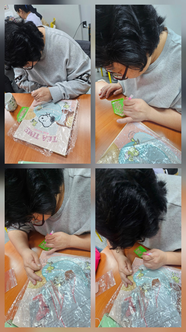 오늘은 추운날씨로 따뜻한 차를 마시며 실내활동을 했어요~ 작은 보석을 정교하게 맞춰 붙여야하는 보석십자수 활동을 했는데 예전보다 집중해서 세심하게 붙이는 모습을 보였어요. 스누피가 언제완성될지는 모르겠지만 멋지게 완성되는 그날을 기다려봅니다! 오후에는 볼링을 쳤는데 오늘따라 점수가 나오지않아 속상해하는 모습을 보이셨어요~~ 그래도 다음엔 잘 치겠지하며 스스로 마음을 다독이는 모습을 보였답니다!! 오늘도 즐겁게 최선을 다하며 마무리했습니다:)