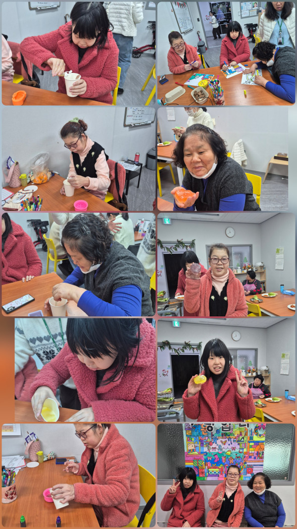 2025.12.26(금)주간활동서비스 1그룹 활동진행 페이지 정보 조회 : 177회 작성일 25-12-26 17:40 SNS 공유 : 본문 혐동화 겨울 그리기와 비누만들기 활동했어요 마음에 드는 몰드를 고르고 비누액을 부어 비누 완성했어요 오후 멋진 미술과마술이 어우러진 퍼포먼스 공연관람했어요 이전글2025.12.26.(금)주간활동서비스 5그룹 활동진행 25.12.26 다음글2025.12.26(금) 주간활동서비스 2그룹 활동진행 25.12.26 목록