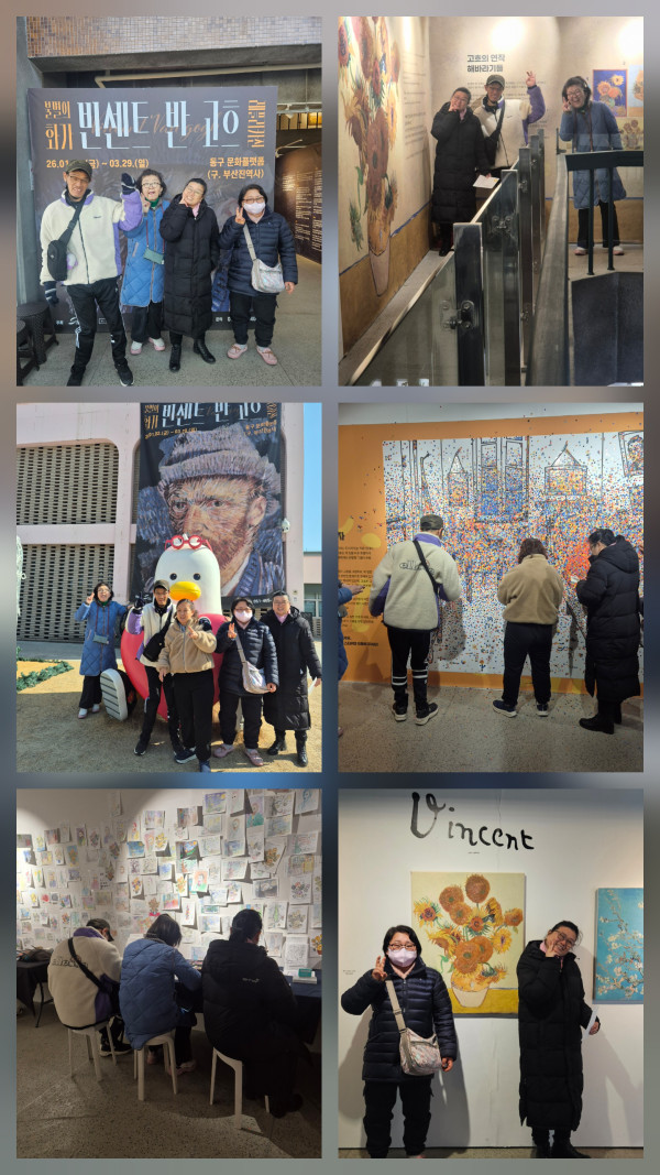 2026.2.12(목)주간활동서비스6그룹 활동진행 페이지 정보 조회 : 5회 작성일 26-02-12 16:09 SNS 공유 : 본문 오전 부산도서관ㅡ부산의 기억전 오후 동구 문화플랫폼ㅡ반고흐 래플리카전 이전글2026.2.12(목) 주간활동서비스 3그룹 활동진행 26.02.12 다음글2026.2.12(목) 주간활동서비스 1그룹 활동진행 26.02.12 목록