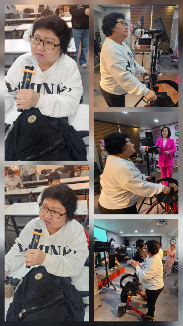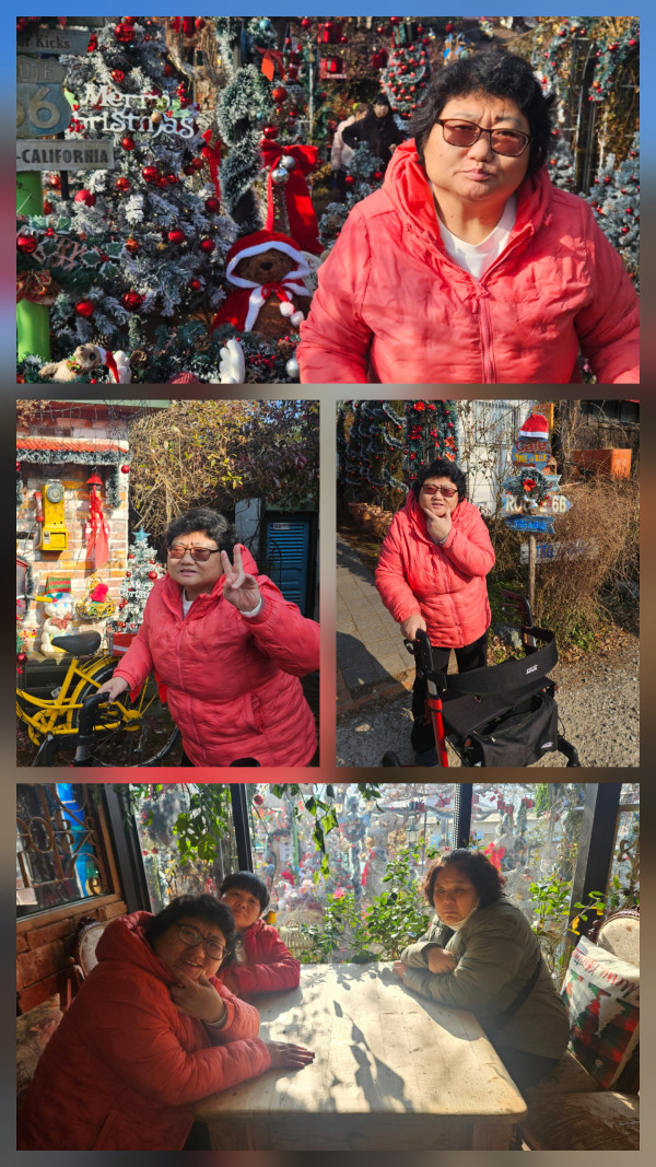 오전 노래교실에서 노래복습 후 개별독창이 있었습니다. 우리 이용자분은 오늘도 '한잔해'를 부르며 신나게 분위기를 띄웠어요. 오늘은 전부 노래가 중복되지 않고 각각 다른 노래를 불렀는데요, 모두 앞에 나가 아는곡들은 따라부르고 춤도추며 스트레스를 해소하였어요. 센터에서 맛있는 점심을 먹고 오후에는 밀양트리인블루카페를 갔습니다. 요즘 핫한 장소라그런지 평일인데도 정말 사람이 많았어요! 예쁜 트리와 장식품들을보며 감탄이 절로 나왔답니다. 다만 길이 좁아서 우리 이용자분이 워커를 끌고 다니기에는 무리가 있었어요.. 여기저기 다니며 사진을 많이 찍어드리고 싶었는데 아쉬움이 남습니다~ 그래도 고구마라떼도 한잔먹고 실내 장식도 구경하며 행복한 추억 남기고 돌아왔어요♡