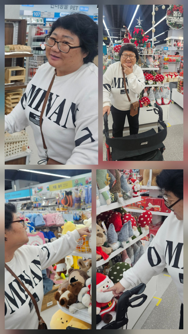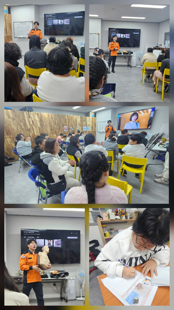 오전 시간은 양산에 있는 라피에스타 복합 쇼핑몰을 가보았습니다~ 하나로마트와 다이소도 있고 1월에 갈 프로그램 장소도 탐방해 보았어요.. 다이소를 그냥 지나치기 아쉽다는 이용자의 말에 바로 다이소로 발걸음을 옮겼답니다:) 여러가지 물건들도 구경하고 크리스마스 물품으로 가득차있는 곳도 너무 이쁘다며 한참을 구경하는 모습을 보였어요! 오후 안전교육 끝나고 먹을 간식도 구입하고 돌아왔습니다. 오후에는 사상소방서에서 소방관들이 오셔서 안전교육을 해주셨어요. 전기화재예방법과 집에 불이났을때 대피하는 법, 심폐소생술 하는법 등을 배웠는데요, 먼저 전기화재예방법은 콘센트에 많은 콘센트를 꽂지말고 안쓰는 콘센트는 빼두기, 무거운 물체를 전선위에 올려 전선이 눌리지않게 하기, 콘센트에 먼지쌓이게 두지말고 주기적 수건으로 닦아주며 청소해주기를 통해 화재예방법을 배웠답니다.