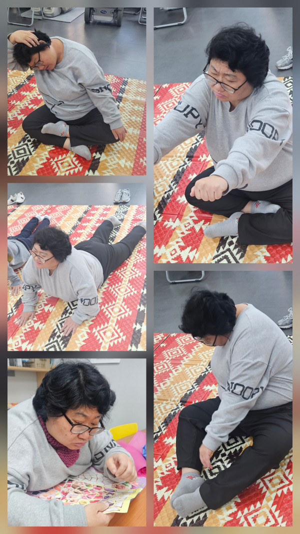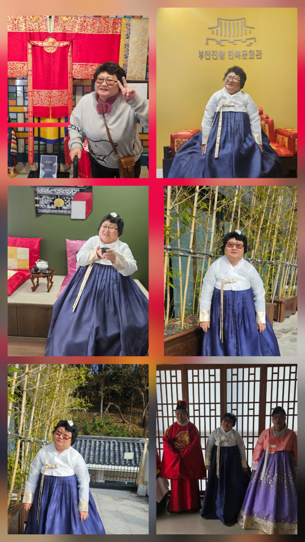 오전에 어댑핏 활동으로 허리와 어깨를 풀고 복부도 단련하는 운동을 해보았습니다. 추워진 날씨로 부쩍 근육이 강직되는것 같아 걱정스러운데 이렇게 스트레칭으로 몸을 풀어주니 한층 움직이기가 쉬워지는 것 같아요. 센터로 돌아와서 점심먹기 전까지 스티커모자이크 활동을 하다가 맛난점심을 먹고 오후에는 한복체험을 하러갔습니다. 파란색 한복이 참 예쁘게 잘 어울리는 우리 이용자분~ 사진을 찍어 보여주니 본인도 스스로의 모습이 이쁜지 만족스러워 하셨어요. 전통느낌이 물씬나는 장소로 이동하여 다양하게 사진을 찍고 돌아왔습니다♡