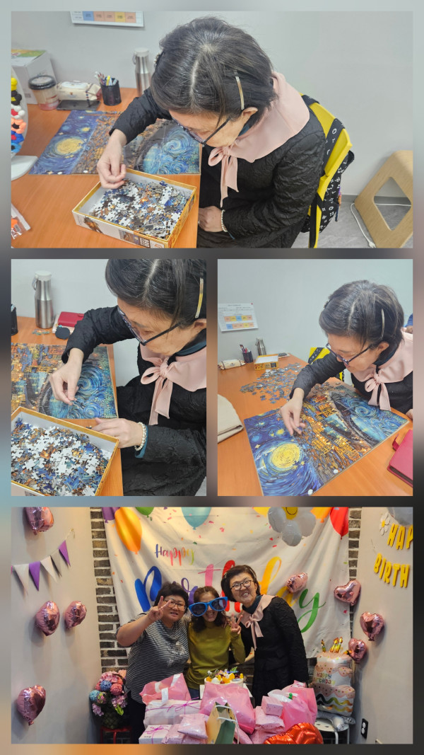 다른 이용자분은 500피스 퍼즐을 액자에 걸기위해 열심히 조립하셨어요. 저는 보고 또 봐도 그 그림이 도대체 어디에 있는지 알수가 없는데요... 우리 이용자분은 정말 기가 막히게 찾아서 조립을 합니다. 옆에서 지켜보던 이용자분들도 잘한다며 박수를 열심히 쳐주었어요!! 빨리 완성된 그림을 보고싶네요~~