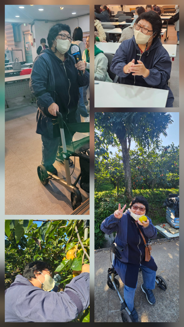 센터에서 맛있는 점심을 든든히 먹고 창원에 위치한 농장으로 단감따기 체험을 갔습니다. 4천평이나 되는 어마어마한 농장에 잘익은 감이 수두룩했어요. 모두 초롱초롱한 눈으로 열심히 감을 수확했습니다. 돌아오는 차안에서 자신이 딴 감을 먹으며 너무 달고 맛있다며 좋아하셨어요. 주변의 모든 곳이 감농장이라 노랗게 주렁주렁 달려있는 나무를 보는 그 모습 또한 장관이었답니다. 눈도 배도 호강하는 시간이었어요♡