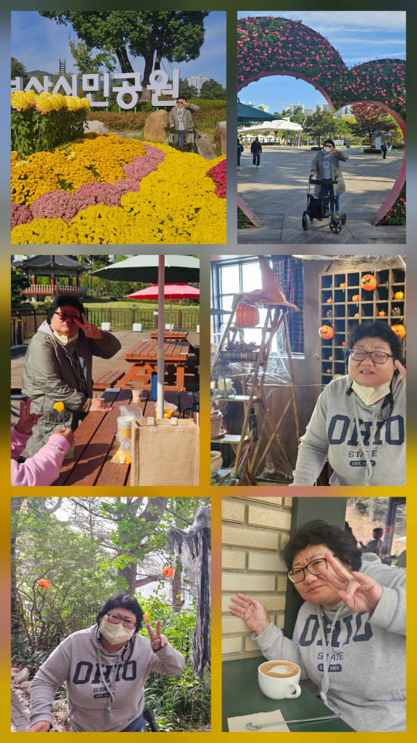 일교차가 심한 요즘, 아침은 쌀쌀했으나 점심이 다되어 갈무렵에는 17도로 기온이 오르면서 제법 포근했어요. 옷깃을 단단히 여미며 간 시민공원이었으나 내리쬐는 태양으로 모두 겉옷을 벗고 여가시간을 보냈습니다. 공원입구 만개한 국화와 함께 사진도 찍고 어제 감농장에서 따온 감과 커피도 가져가서 함께 먹으며 티타임도 가졌어요. 공원을 거닐다보니 넓은 잔디밭에서 유치원 운동회도 하고있었어요. 청팀, 홍팀 나누어 고사리같은 손으로 공굴리기 하는 모습이 어찌나 귀엽던지 모두 미소를 띄며 구경했어요. 따뜻한 가을햇살아래서 여유롭고 행복한 시간보내며 돌아왔습니다!