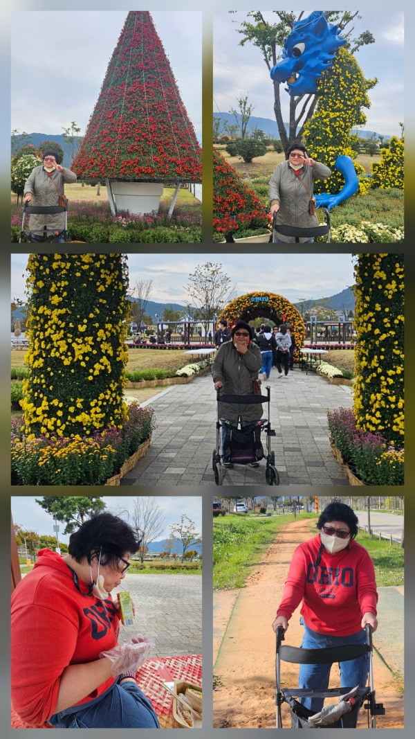 10월의 마지막 날을 캠크닉으로 마무리하고자 황산캠크닉장으로 신나게 달려가 보았습니다. 날이 흐려 오전은 제법 쌀쌀했지만 점점 햇살이 비추며 따뜻한 날씨로 바뀌었어요. 마침 캠크닉 옆 공원에서도 국화축제가 열리고 있어 알록달록 예쁘게 핀 국화를 구경하며 열심히 사진을 찍었답니다. 점심은 돗자리를 펴고 유부초밥과 샌드위치를 먹으며 이야기를 나누고 소화도 시킬겸 황토길도 걸어보았어요. 요즘 핫한 '어씽'은 맨발로 해야 제대로인데 보행이 조금 불편하여 보조기구를 의지한채 신발을 신고 걸어보았습니다. 많이 걷는 하루라 힘들었을텐데 제법 씩씩하게 잘 걷는 이용자분이 대견하기도하고 다리근력이 더 생겨서 저와 함께 좋은 곳을 보며 걷는시간이 더 많아졌으면 좋겠다는 생각도 해보았어요. 따뜻한 햇살아래 행복한 시간 보내고 돌아왔습니다♡