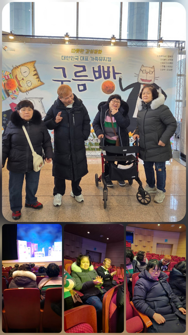 2026.1.23(금) 주간활동서비스 1그룹 활동진행 페이지 정보 조회 : 67회 작성일 26-01-23 16:31 SNS 공유 : 본문 오전 대연수목원 내 아열대식물원 구경하고 박물관 둘러보았어요 오후 구름빵 뮤지컬 관람했어요 이전글2026.1.23(금) 주간활동서비스 2그룹 활동진행 26.01.23 다음글2026.1.23(금) 주간활동서비스 3그룹 활동진행 26.01.23 목록