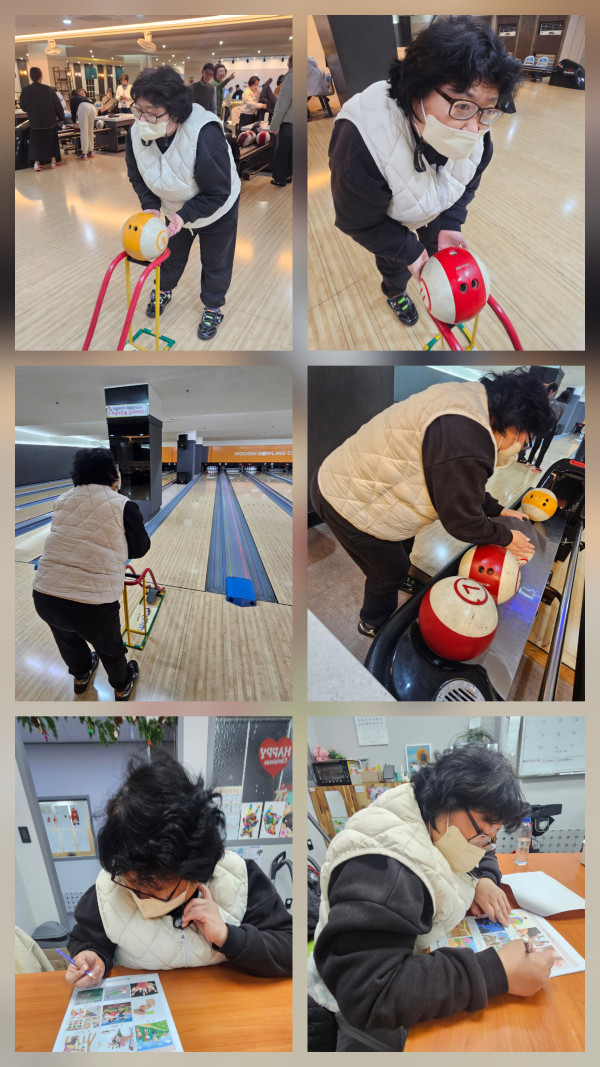 오전 다소 쌀쌀한 날씨지만 따뜻한 커피를 한잔씩 들고 인근에 있는 절로 마실을 나가보았어요. 드문드문 핀 홍매화가 예쁘게 자리잡고 있고 파릇파릇 봄잎들이 살며시 고개를 내밀고 있었습니다. 다리가 불편하여 위쪽까지는 올라갈 수 없었지만 아래에서 올려다보는 경치도 제법 아름다웠어요. 경치구경 후 센터로 돌아와서 점심을 먹고 볼링교실을 갔습니다. 지난 주 설연휴로 2주만에 간 볼링장에서 우리 이용자분은 높은 점수를 내었어요. 10분 정도 여유시간이 있어 욕구조사를 하며 3월 매화꽃과 벚꽃을 보러 꽃놀이를 가자고 적는 우리 이용자분의 욕구를 충족시키러 3월은 신나게 나들이를 가보아야겠습니다!! :)