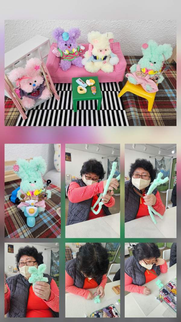 단체 합창을 시작으로 모두 목을 풀고 개별독창을 시작했는데 우리이용자분은 블링블링을 불렀습니다. 한잔해와 블링블링을 너무 많이 불러 이제는 다른 곡을 연습해보자고 하니 웃으며 알겠다고 하셨어요~ 오후에는 모루인형만들기를 하러 서면 공방을 갔습니다. 워밍업으로 얇은 모루철사를 이용해 먼저 만들어보고 예쁘게 모루인형을 만들었어요. 토끼를 만들었는데 모루인형만드는것보다 꾸미기에 진심인 우리 이용자분들... 옷부터 악세서리까지 본인에게 꾸미는 것처럼 고민 또 고민하며 골랐답니다! 완성된 모루인형 사진도 찍고 가방에도 달며 함박웃음을 보였어요~~ 행복한 시간 보내고 왔습니다:)