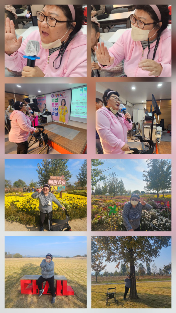 오늘은 노래교실에서 여러곡을 복습하고 각자 선곡한 곡을 불러보는 시간을 가졌어요. 지난주 감기환자가 너무 많아서 동료가 부르는 것을 구경만했는데 이번주는 감기가 다 나은 이용자들이 더러있어 지난주 못불렀던 몫까지 열심으로 불렀답니다~ 우리 이용자는 장윤정의 '어머나'를 신나게 불렀고 동료들의 신나는 곡이 나올때마다 박수와 춤으로 함께했어요.
