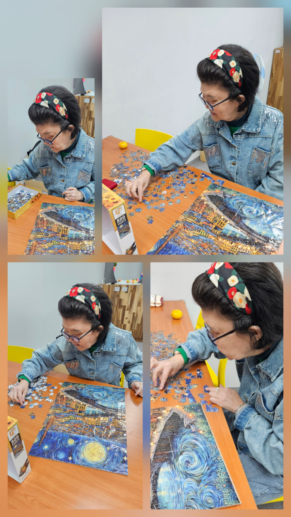 갈비뼈 통증으로 고생한 다른 이용자분이 다소 회복된 모습으로 오늘 센터에 왔습니다. 동적인 활동이 어려워 퍼즐맞추기로 오전활동을 해보았어요. 아직까지는 통증이 있어 한의원에가서 침을 맞고 왔다고 하시는데 얼른 회복되어 함께 외부활동 나가기를 소망해봅니다♡