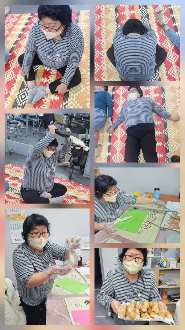 점심을 먹고 시작된 요리활동은 가래떡을 활용해서 꽈베기를 만들고 시나몬슈거를 뿌려 먹는 요리였어요. 다들 떡을 자르고 굽고 설탕을 묻히며 열심히 만들고, 완성된 요리는 모든 이용자분들과 함께 나눠먹는 시간을 가졌습니다. 달콤하고 쫄깃쫄깃한 꽈베기가 정말 맛있었어요. 살찐다고 걱정하면서도 멈출 수 없는 손!! 맛있는 요리에 마음도 배도 행복한 시간이었습니다♡