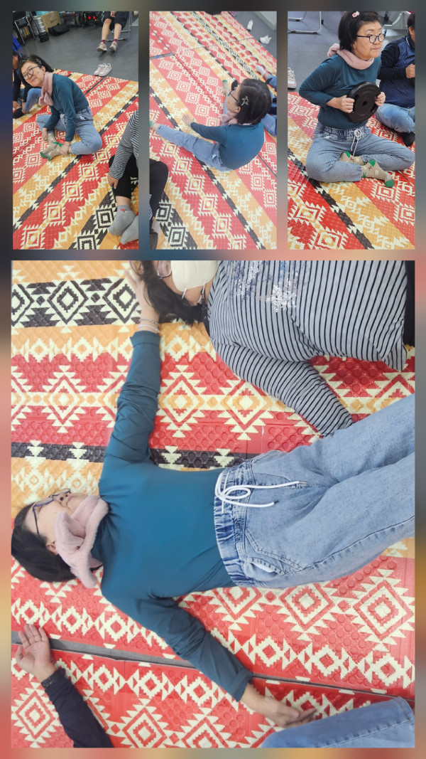 오늘 어댑핏은 어깨 근력을 강화하는 운동을 중점으로 진행했어요. 5키로 무게의 추를 들어올려 코어와 팔, 어깨를 강화하고 두명씩 짝지어 윗몸일으키기도 했습니다. 다리가 불편하고 코어근육이 약한 이용자분은 제가 등을 잡고 밀어주며 천천히 해보고 또 갈비뼈가 아직 욱씬거리는 이용자분은 가벼운 폼블럭을 사용해서 운동을 했어요~