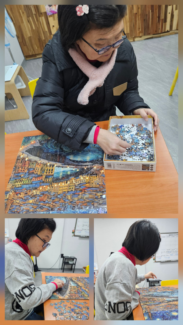 우리 이용자분께서 활동지원사 선생님과 저에게 편지를 쓰고 싶다고 하셨어요:) 한글을 잘 모르는 분이셔서 불러주는대로 제가 종이에 적어드리고 그 종이를 보며 편지지에 그대로 적었답니다. 정성스럽게 한자한자 눌러쓴 편지를 받으니 또 다른 감동이 왔어요. 다른 이용자분은 오늘도 퍼즐삼매경!! 이제 3분의 2 정도 완성되었습니다! 얼른 완성시키고 싶어 마음이 급한지 서두르는 모습이 보였어요~ 차분하게 퍼즐을 맞출수있도록 독려했습니다~~