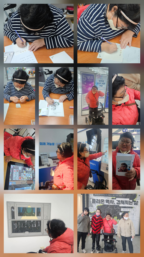 오후에는 부산도서관에가서 AI체험도 하고 '흘러온 역사, 겹쳐지는 삶'이란 주제로 열리고 있는 전시회도 구경했어요.