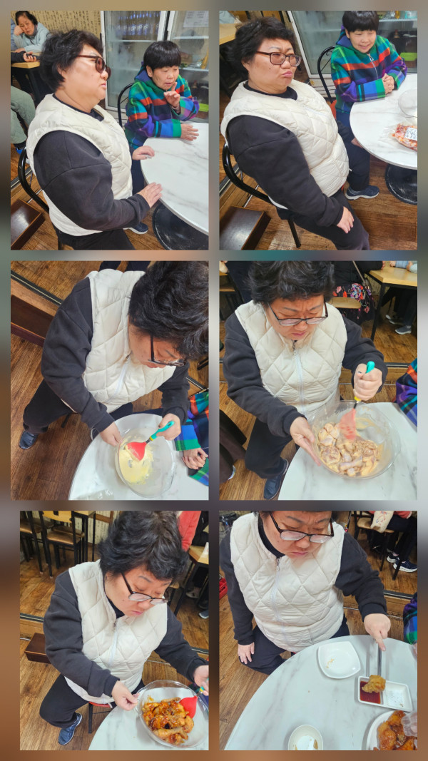 보석십자수를 하고 어댑핏 운동하러 갔습니다. 코어를 강화시키고 다리근력을 키우기 위해 도구들을 사용하여 스트레칭과 코어운동을 해주었어요. 동료이용자 생일파티 후 오후프로그램으로 요리체험을 나갔습니다. 점심 직후라 배가불러 본인이 만든 음식을 먹어보지 못하겠구나 했는데 우리 이용자분들을 과소평가했어요...>.< 그릇을 싹싹비워내고 소화시킬 겸 주변 산책 후 센터로 돌아왔습니다. 모두 행복한 시간 보내고 돌아갔습니다!!