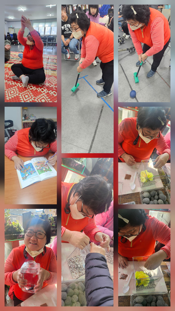 오늘 날씨가 너무너무 추워서 다들 옷을 두텁게 입고 센터로 모였어요. 마침 오늘 운동하는 날이라 자칫 굳어질 수 있는 몸을 스트레칭으로 풀어주고 게이트볼 놀이를 했습니다. 두팀 편먹고 상대공을 쳐서 아웃시키기도하고 장애물을 통과하기도하며 두명의 우승자가 나오며 1대1로 비겼답니다~