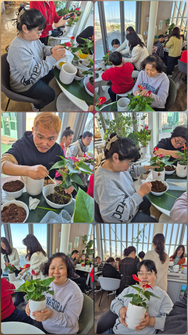 오후 꽃꽂이 수업참여하여 안시리움 심기 했어요