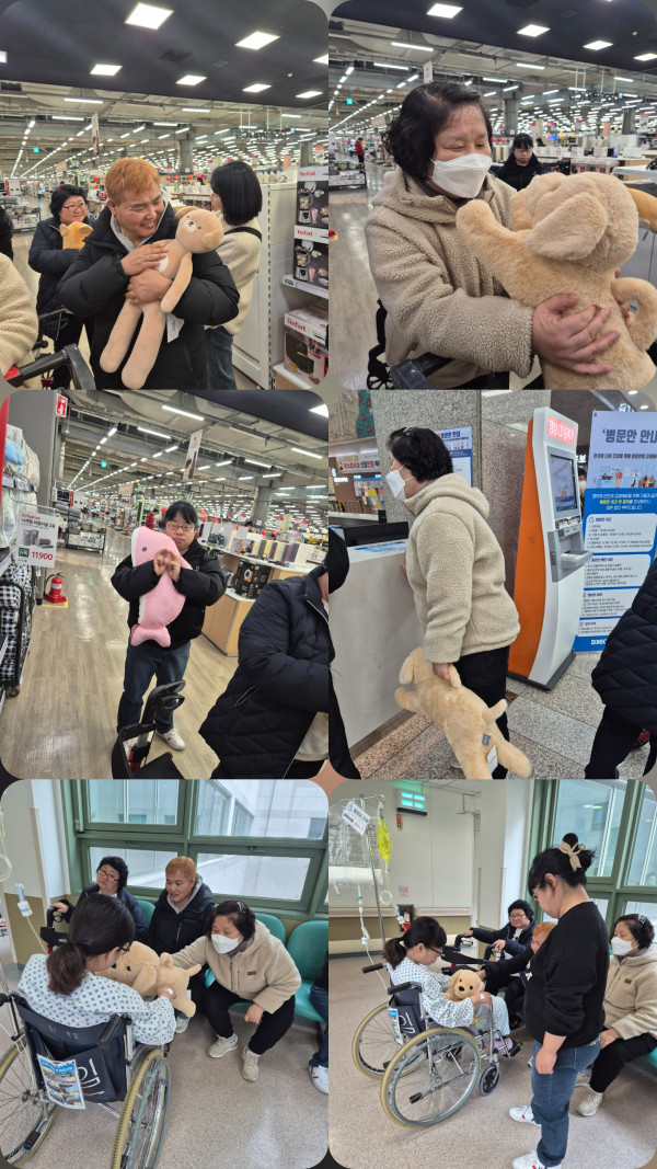 오전 마트에서 병문안 갈 이용자 인형구입하고 병원에 가서 인형 전달하고 빨리 나으라고 기도도 해주었어요