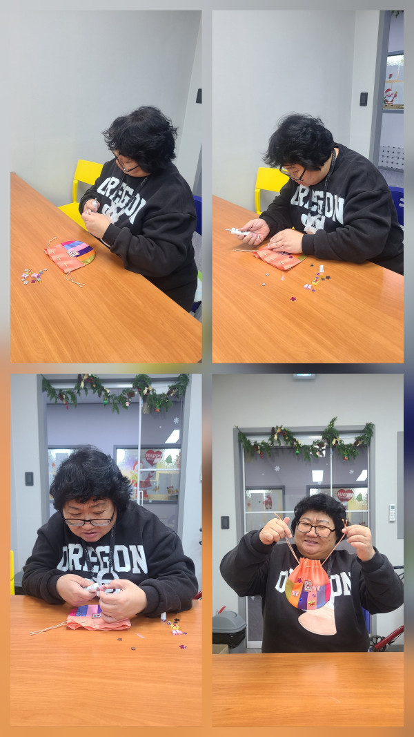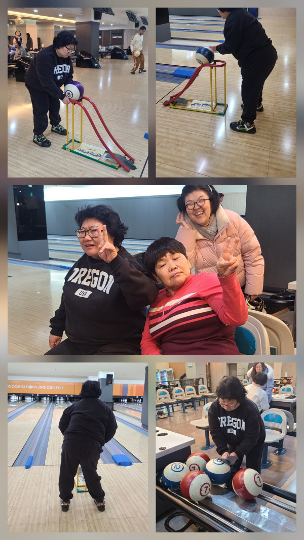 복주머니에 다양한 꾸밈스티커를 붙여 예쁜 복주머니를 만들어 보았습니다. 예로부터 복주머니는 오래 살거나 좋은 일이 생기기를 바라는 마음에서 나비, 국화, 십장생(해, 산, 물, 돌, 구름, 소나무, 불로초, 거북, 학, 사슴) 등의 무늬를 새겼다고해요. 옛날에는 자손이나 친척들에게 복주머니를 나눠주는 풍속이 있었는데, 복주머니를 차면 복이 온다고 믿었고, 나쁜 일을 막을 수 있다고 여겼기 때문에 설이 되면 설빔에 차고 다니기도했어요. 예쁜 복주머니를 만든 우리 이용자분도 건강하게 오래오래 살기를 바래봅니다!! 센터에서 맛있는 점심을 먹고 볼링장으로 향했어요~ 오늘도 여전히 좋은 컨디션으로 볼링을 치고 같은 조에서 2등을 했답니다! 오늘도 즐거운시간 보내고 하원하였어요~