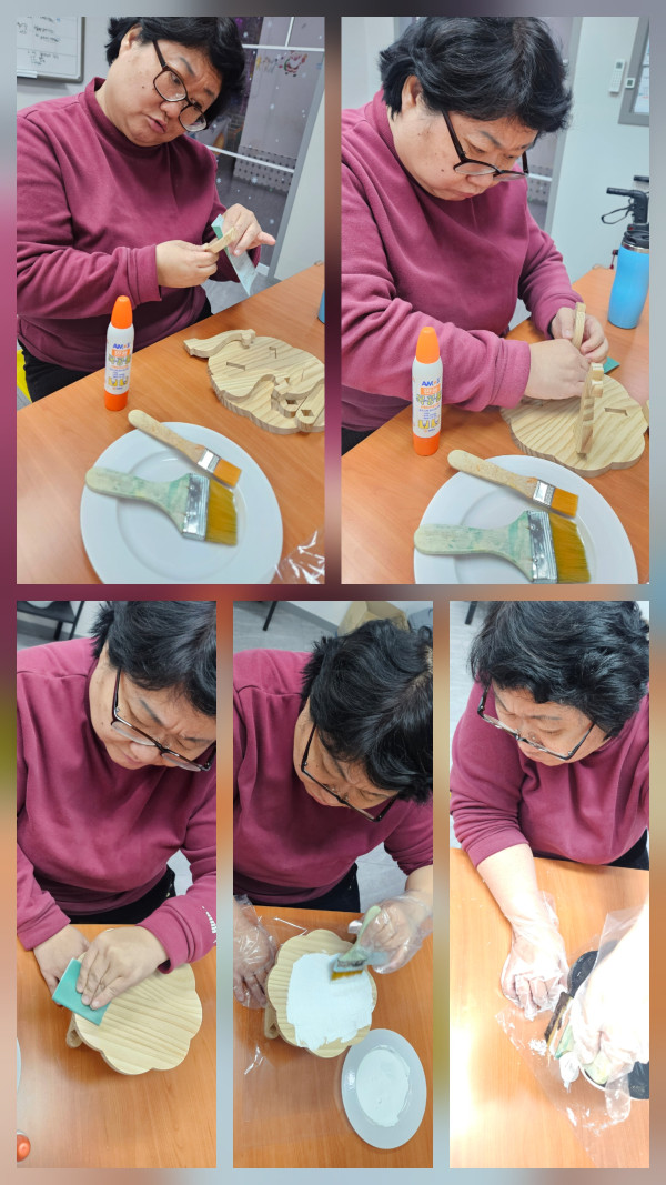 오늘 공예활동으로 자개상만들기를 했습니다. 먼저 나무를 사포로 문질러 매끄럽게 다듬어주고 잿소와 아크릴물감을 덧칠해주었어요. 마르는 시간도 있어 오전시간내에 완벽히 끝내지는 못했고 내일 오후와 이어 활동하고자 해요.