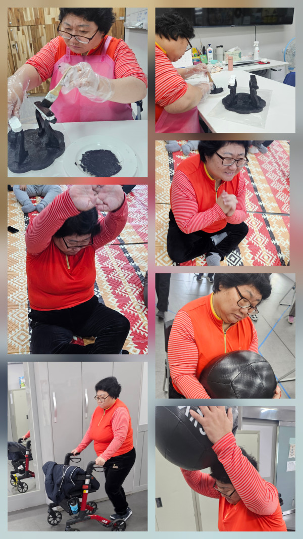오늘은 어제에 이어 공예활동을 했습니다. 오후에 전통문양을 배치해서 붙이는 작업을 해야해서 오전시간 마감칠을 하며 마무리해주었어요. 어댑핏은 스트레칭을 시작으로 3킬로그램의 고무공을 들고 위에서 아래로 던지며 어깨와 코어근육의 힘을 기르는 시간을 가졌습니다. 우리 이용자분은 고무공을 안고 중심을 잡으며 서는게 잘 안되서 여러번 멈칫하였으나 힘을 주고 서서 동작을 잘 수행하였어요!!