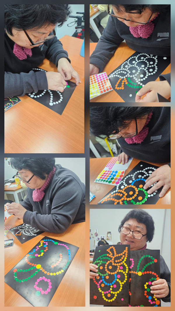 오전에 사과와 포도 모양의 도안에 동그라미 스티커를 붙여보았어요. 색깔이름을 잘 알지못해 색깔이름도 같이 말하면서 붙여보았고 동그라미 안을 최대한 잘 맞춰 붙일 수 있도록 노력해보았습니다. 또 동료의 생일파티가 있어 함께 축하해주는 시간도 가졌어요:)