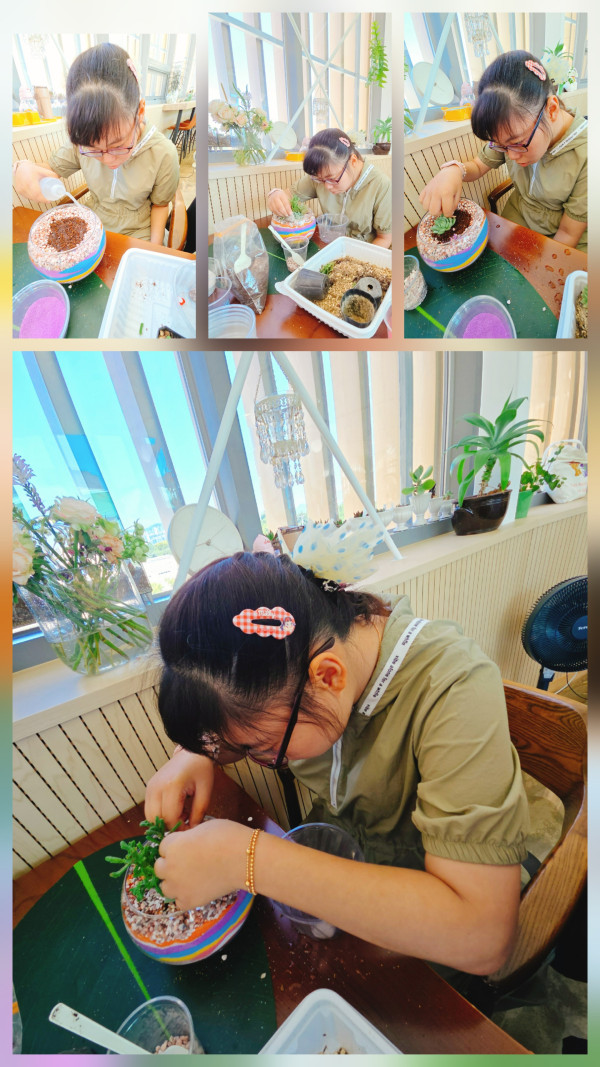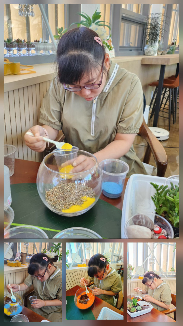 꽃꽂이 활동 시간으로 오늘은 다양한 색깔의 모래와 흙,자갈,등을 이용해 다육이를 심어보는 활동 하였습니다.