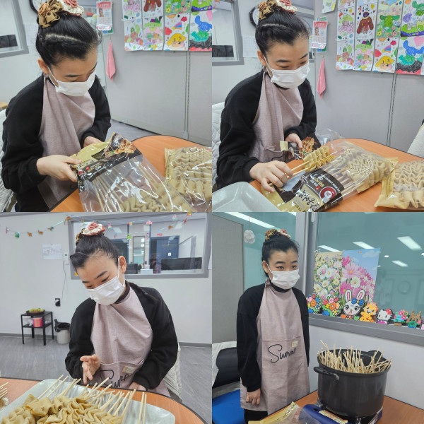 오늘 오전에는 함께 비닐을 뜯어 재료를 준비하고 물을 끓여 어묵탕을 끓여보았습니다