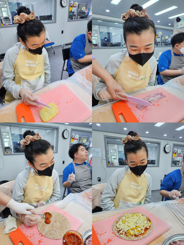 재료를 썰고 소스를 발라 치즈를 올리는 활동으로 소근육운동을 해보고