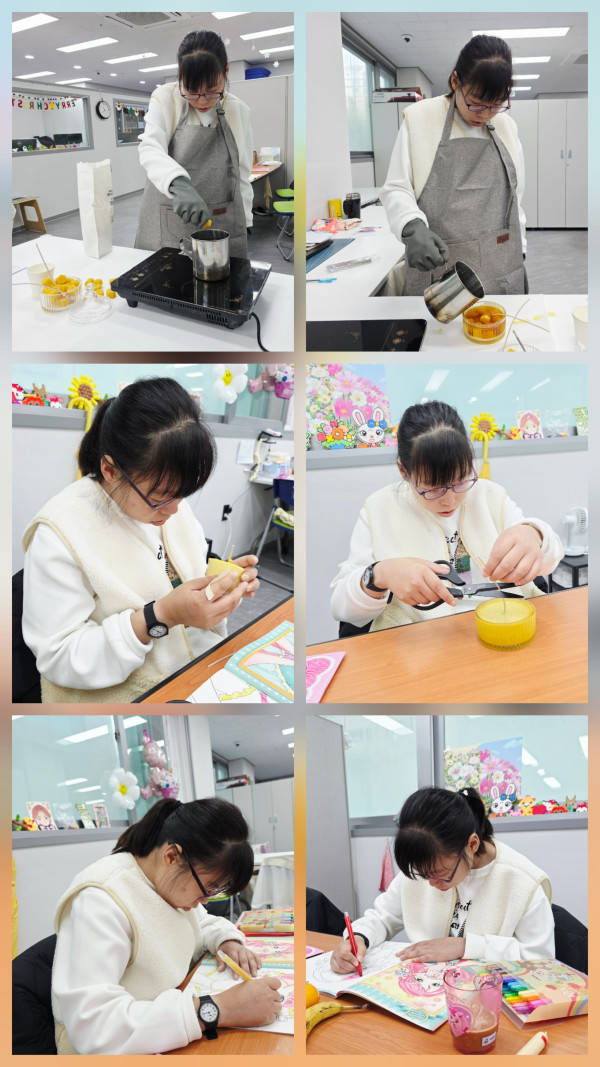 천연밀랍을 녹인 후 예쁜 모양의 틀에 부어 향초 만들기 활동했습니다.