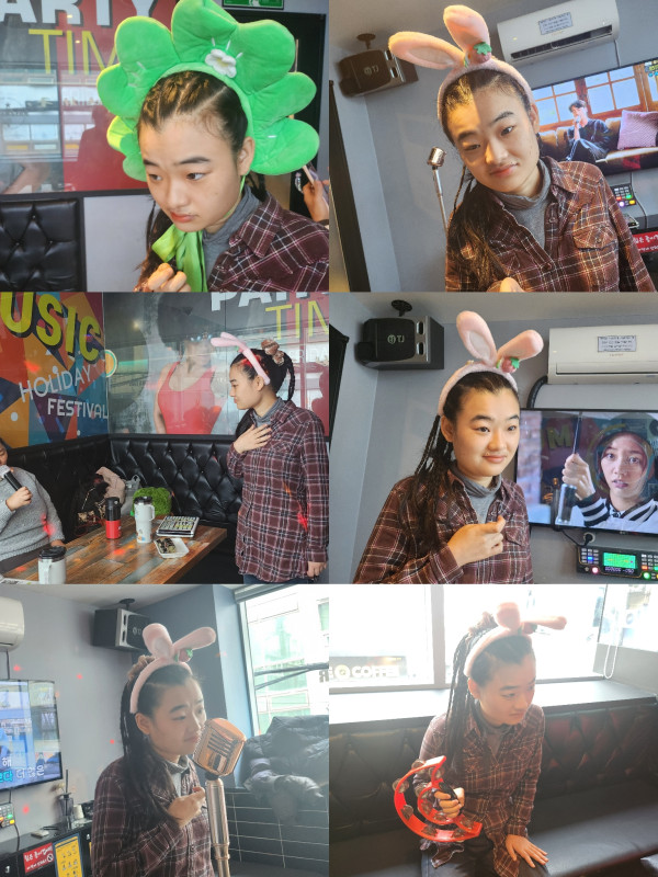 노래방에서 선생님들과 다른 이용자들이 부르는 노래를 들으면서