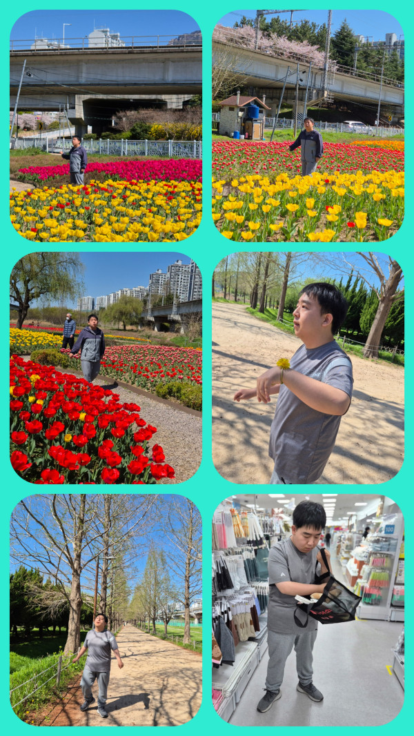 오후에는 화명 생태 공원과 생일 선물 구입을 위해 다이소를 다녀왔습니다. 튤립 정원의 만개한 튤립을 구경하고 공원 주변을 산책하였습니다.