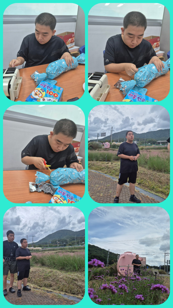 오전에는 다른 이용자의 생일 잔치를 위해 선물 포장을 하였습니다.직접 테이프를 떼어서 포장지에 붙여보았습니다.