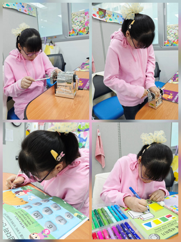 이용자가 좋아하는 숫자 쓰기와 스티커 붙이기, 도형 익히기 활동했습니다.