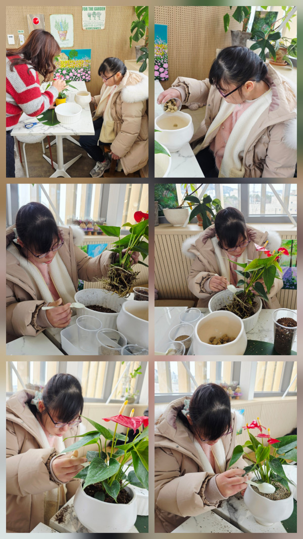 꽃꽂이 시간 안수리움 모종을 옮겨 심으며 식물 심기 활동했습니다. 이후 카페를 둘러보며 각종 테라리움과 물고기 등을 구경했습니다