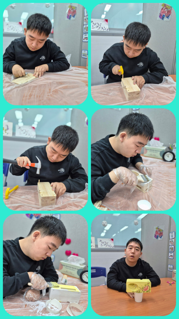오전에는 우드 스피커 만들기를 하였습니다. 냅킨을 오려서 붙여 완성하였습니다.