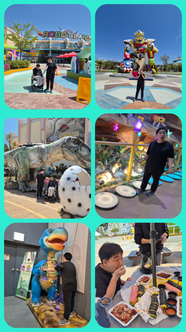 2026.4.15.(수) 최중증통합돌봄서비스 3그룹 활동진행 페이지 정보 조회 : 18회 작성일 26-04-15 17:27 SNS 공유 : 본문 로봇랜드를 다녀왔습니다.오전에는 공룡 월드에서 다양한 공룡을 구경하였고 식사 후에는 여러가지 놀이 기구를 타고 여러 종류의 로봇도 보았습니다. 이전글2026. 4. 15.(수) 최중증통합돌봄서비스 5그룹 활동진행 26.04.15 다음글2026.4.15.(수) 최중증통합돌봄서비스 4그룹 활동진행 26.04.15 목록